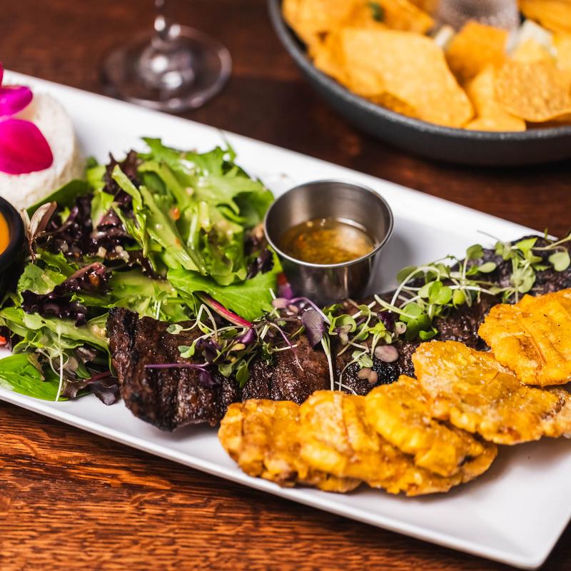 Skirt steak rice beans side salad served withmaduros | Add Shrimp +$7.00
