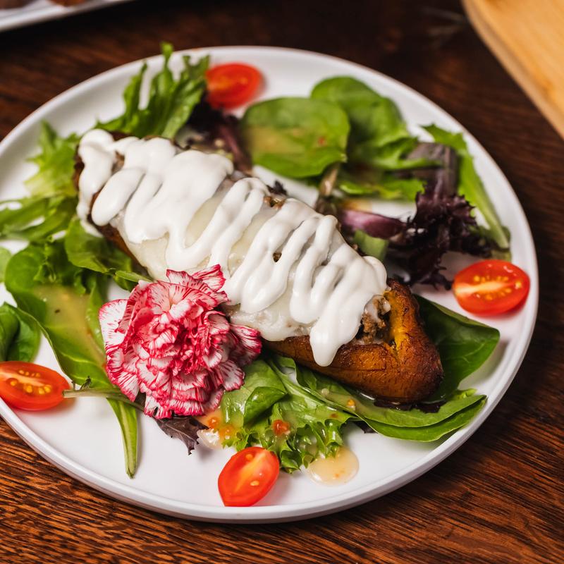 Sweet plantain filled with ground beef or chicken, mozzarella cheese, topped with sour cream
