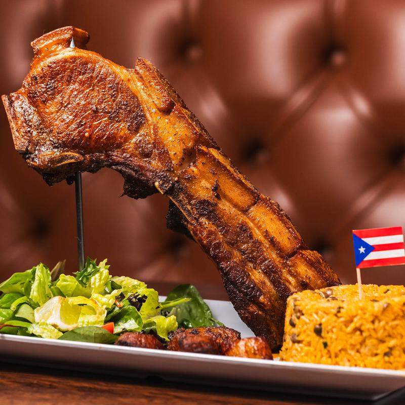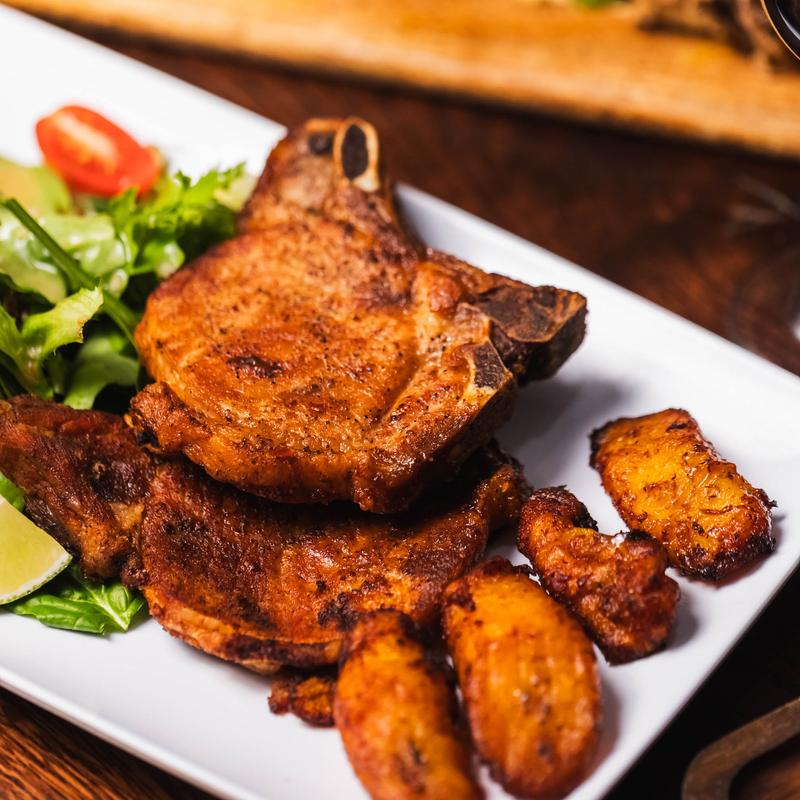 Thick cut pork chop with belly & rib served with yellow rice & peas salad & sweet plantains