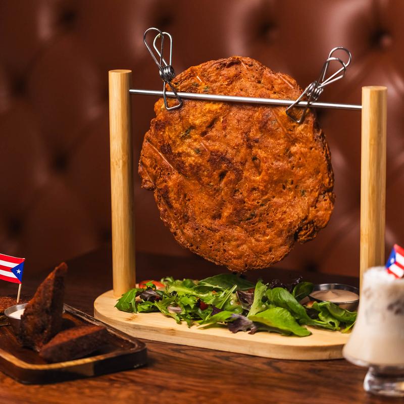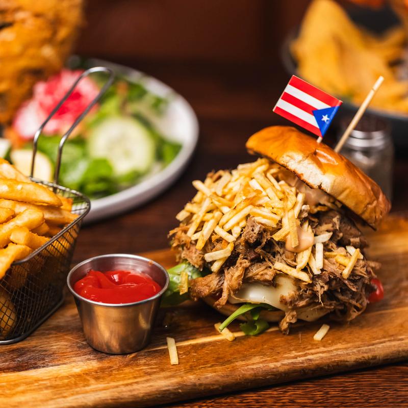 Burger topped with pernil, mozzarella cheese, potato stick,s special sauce, mixed greens & cherry tomatoes, side French fries